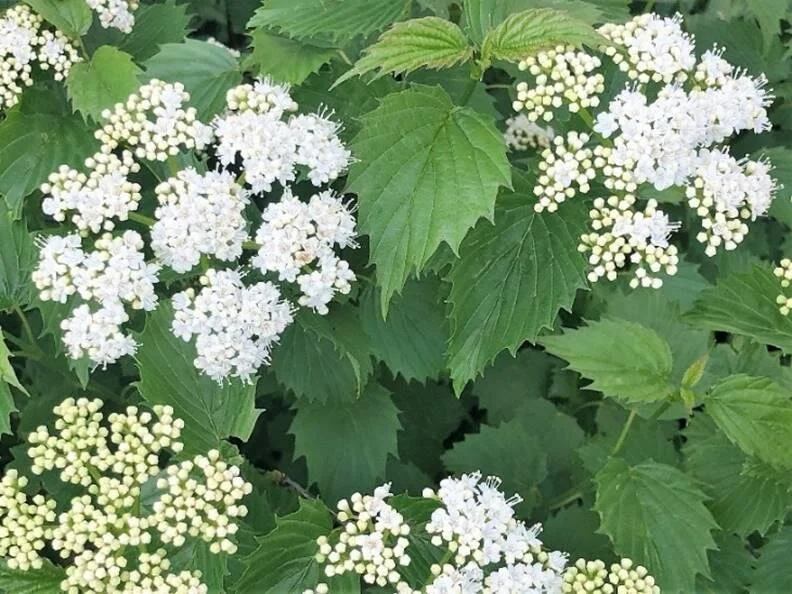 The Viburnums are a wonderful group of native landscape shrubs with multiple seasons of interest. Arrow-wood, Viburnum dentatum, is a standout among them and is native to the Coastal Plain of Virginia including all of the Northern Neck, where it is found in moist floodplain forests, wet flatwoods, seepage swamps and even tidal and alluvial swamps. Despite its affinity for moist soils, it can also be found in dry upland woods. As we enter early fall, this Viburnum is a showstopper and brightens its surroundings with large clusters of 1/3” diameter fruit which ripen to a deep blue to blue-black that are particularly showy against the colorful fall foliage that ranges from yellow to vivid red. In late spring, it is covered in showy 3 - 4” diameter flat-topped clusters of lacy white flowers. Each small flower has five petals and a burst of yellow stamens. Alas, the flowers are not fragrant.