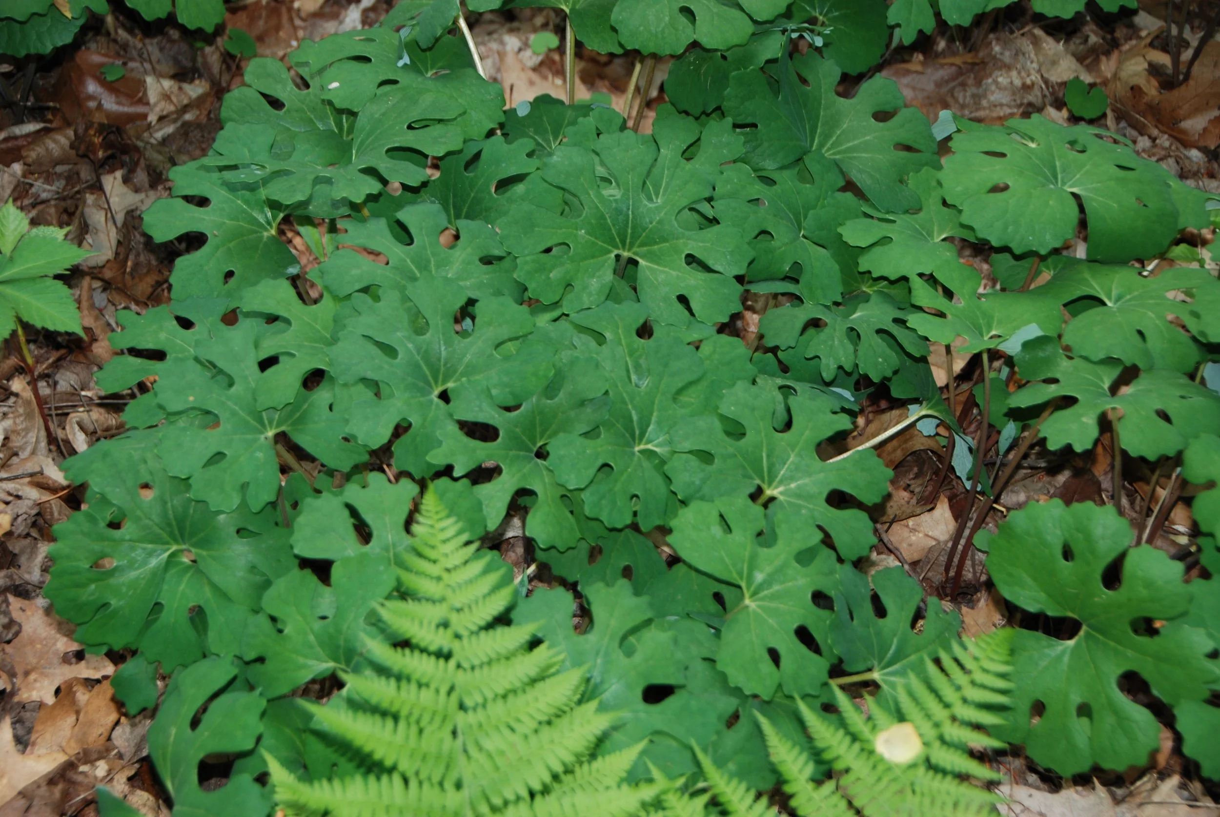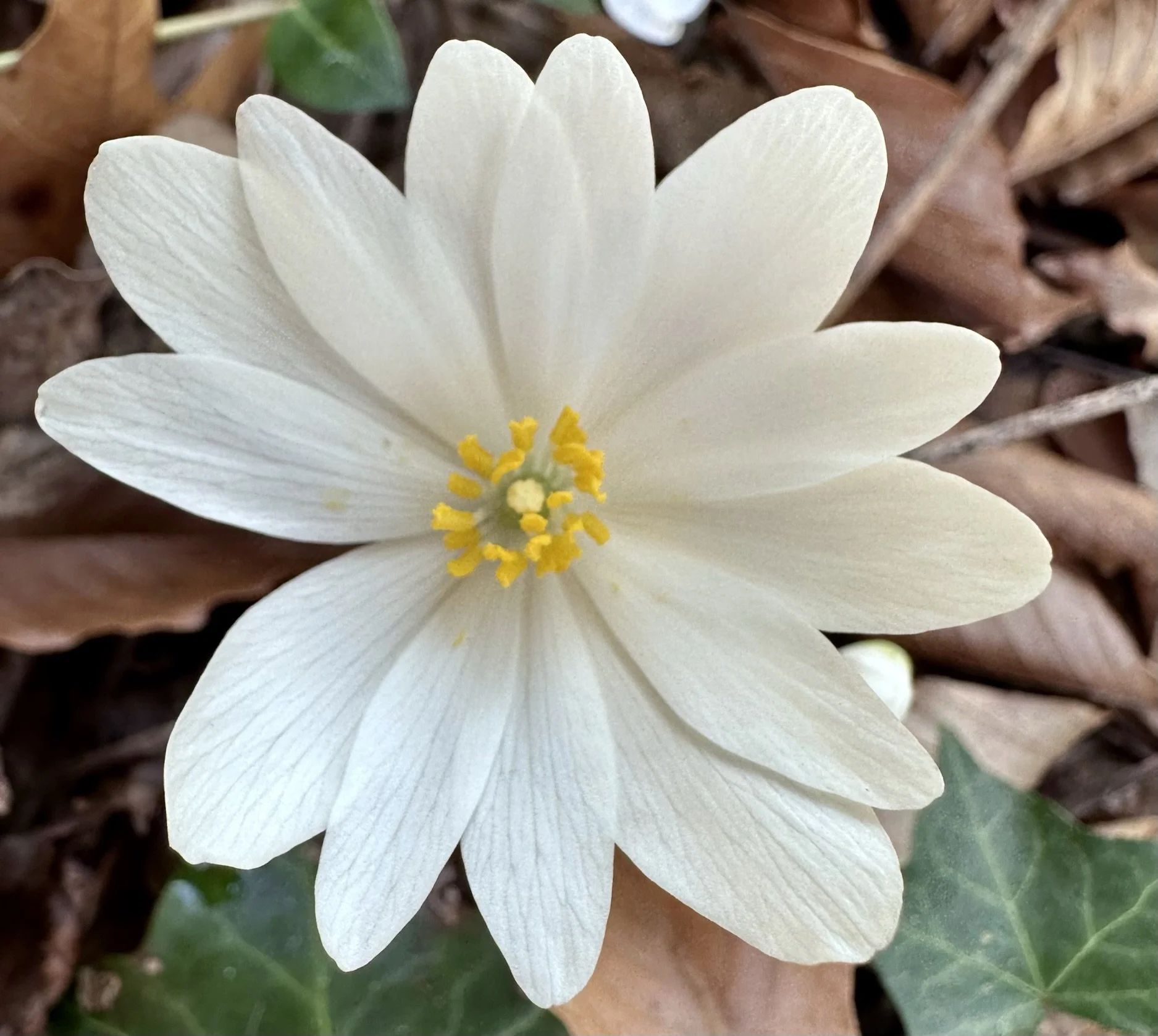 This member of the Poppy Family reaches only as high as 8” high, however the 2-inch wide flowers are drop-dead gorgeous but fleeting – often lasting only a few days. Snow-white buds typically emerge in early to mid-March but this year with our record-breaking warm winter, they are blooming earlier than ever – in February. Each erect flower stem is enfolded in a single leaf that curls around it revealing the intricately veined undersides of the leaf. Eight to ten crystalline white petals open to reveal a central burst of golden stamens and single green pistil; if you look closely you will see they are slightly asymmetrical with four petals being slightly larger than the others. The waxy blue-green leaves themselves are attractive, with an orbicular or kidney shape with five to seven distinctive rounded lobes along the margins. After the delicate petals have fallen, the leaves continue to expand and can reach up to ten inches across, creating a stunning groundcover. The fruit is a spindle-shaped green capsule that splits open to expel the small brown seeds. These are dispersed by ants that seek out the nutritious fatty bundle (an eliasome) attached to each seed to take back to their nests, eagerly eating the eliasome and discarding the seeds in their “compost” pile, thereby dispersing the seeds.