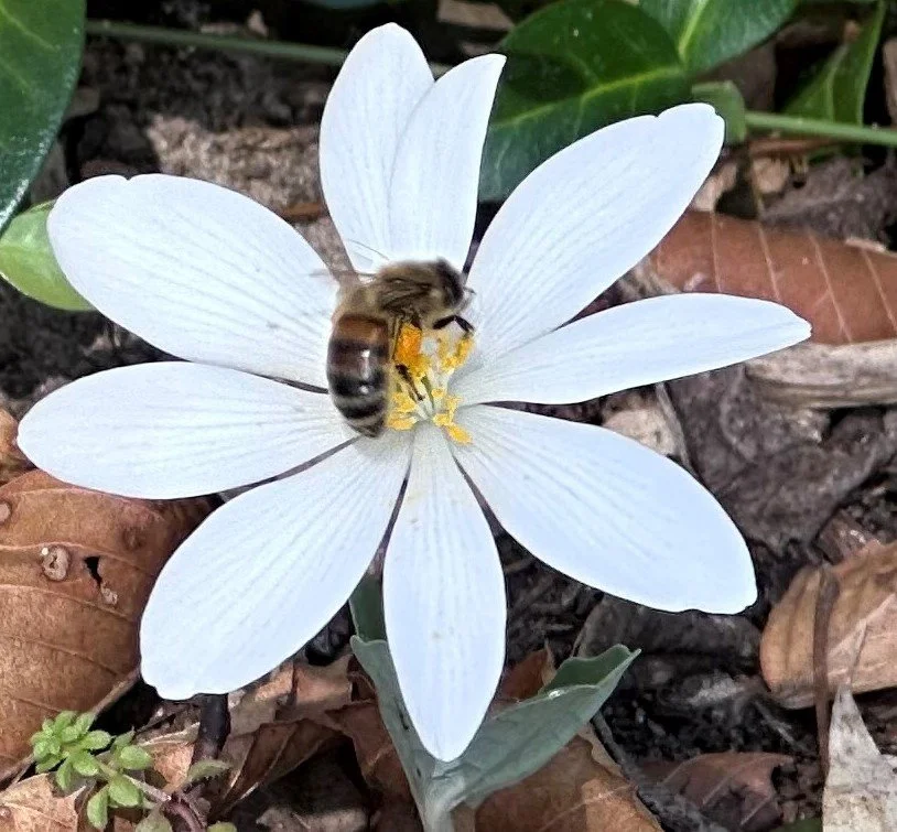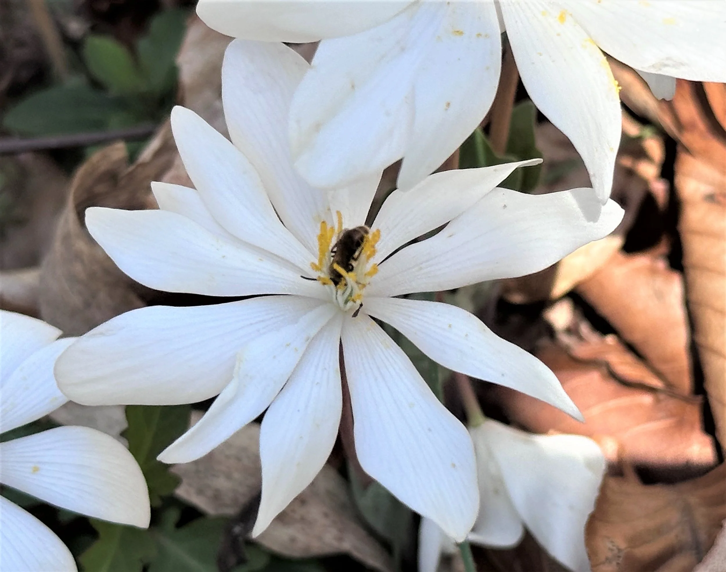 Like several other early spring ephemeral wildflowers, Bloodroots do not produce nectar. Instead, early pollinators such as small miner bees, sweat bees and bee flies