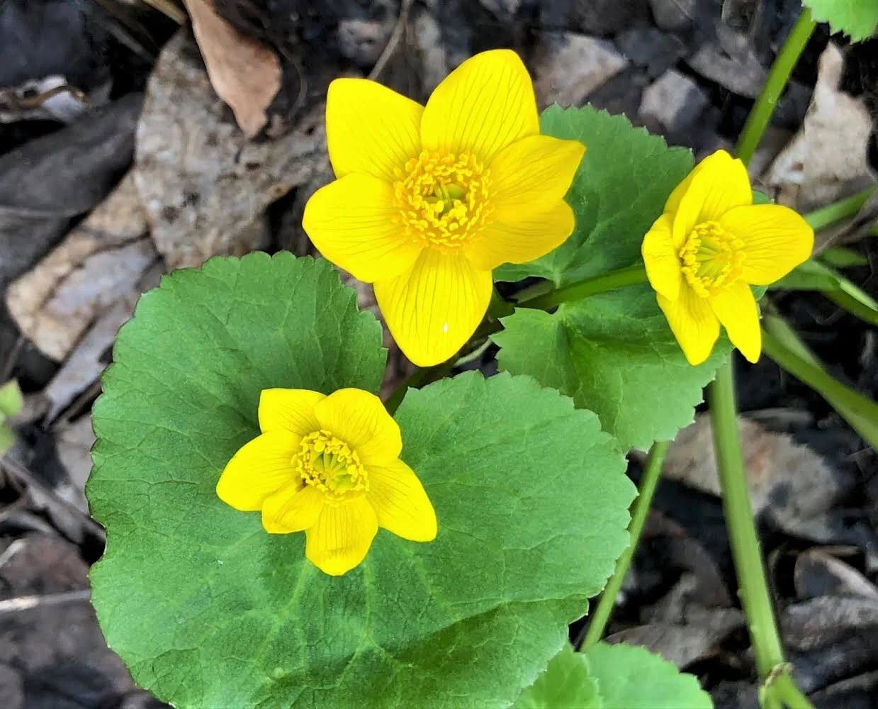 Despite their rare to infrequent occurrence in our area, Marsh Marigolds are fairly easy to grow and maintain in gardens with consistently moist soils such as along the margins of ponds, streams, bogs, or low swampy areas. They can tolerate shallow flooding up to 4” during spring. While they bloom more profusely in full sun, afternoon shade is beneficial in our southern climate, as Marsh Marigolds may go dormant in summer if the soil dries out. The fleshy rhizomes can be divided in fall to increase plantings or they can be planted from seed, but never, ever collect these treasures from the wild!