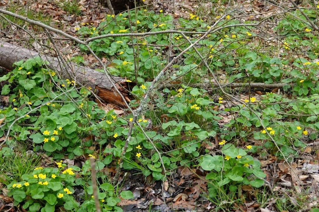 This perennial tends to spread by rhizomes into small colonies in wet soils and seepage swamps as we have at Cabin Swamp. They are native to swamps, seeps, fens, and low wet woods and meadows, and are circumboreal in northern areas but occur in North America from Newfoundland west to Manitoba, south to Virginia and along the mountains in North Carolina and Tennessee. There are also separate populations in Alaska and the Pacific NW. While common in the mountains of Virginia, Marsh Marigolds are rare in the Piedmont and Coastal Plain of Virginia being found only in a few Coastal seepage swamps at the foot of steep ravines, such as the rare calcareous seepage swamp of Hickory Hollow’s Cabin Swamp. In these rare habitats, other unusual mountain disjuncts also make their home. Mountain disjuncts, as the phrase suggests, are species normally found in the mountains, but which occur in distant habitats without populations in between. We are lucky indeed to have such a beautiful and rare seepage swamp to enjoy here in Lancaster County that is protected by the ownership of Northern Neck Audubon and management by the Virginia Dept. of Conservation and Recreation.