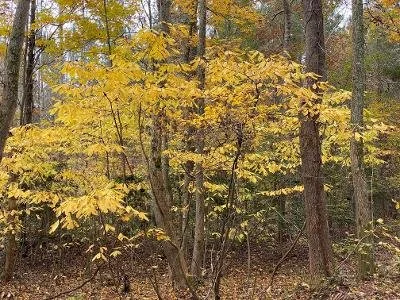 Pawpaws are distinctive small trees and have large, rather tropical-looking, drooping leaves that can reach 12” in length and up to six inches wide. In shady areas, the leaves are fanned out along the stout branches, in an arrangement that allows the tree to absorb the maximum amount of limited sunlight beneath the often-dense forest canopy. In fall the lush foliage turns a clear, showy yellow, lighting up the shady understory. Pawpaws tend to spread into colonies via root suckers especially in rich, moist woods, so that what appears to be many individual trees is actually a single colony of genetically identical individuals. The bark is smooth gray-brown but develops small, warty raised pores (lenticels) as it ages.