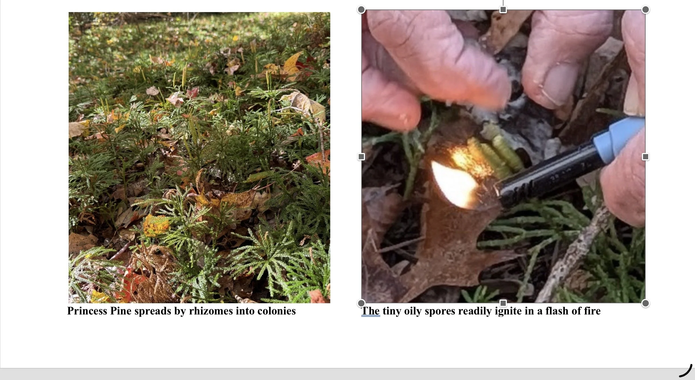 Although Princess Pine spreads widely by rhizomes, it also produces spores through reproductive structures called sporangia. These upright yellowish “club”-like sporangia form directly at the clubmoss top in late summer-early fall. These clubs are spore “factories” producing tiny, oily, golden spores that are dispersed by winter winds or wandering wildlife. If these tiny spores are fortunate enough to fall on suitably moist soil or leaf litter with the right fungus, they may begin a rather complex alternate life cycle. Hidden from us, they reside underground and cannot photosynthesize but are completely dependent on a symbiotic mycorrhizal fungus to provide all of their nutrients. Although research is limited, it is estimated this underground stage can last as long as 8 to 20 years. This stage eventually reproduces sexually underground and the above ground life cycle begins anew. All stages of clubmosses appear to be dependent on mycorrhizal fungal partners at least in part.