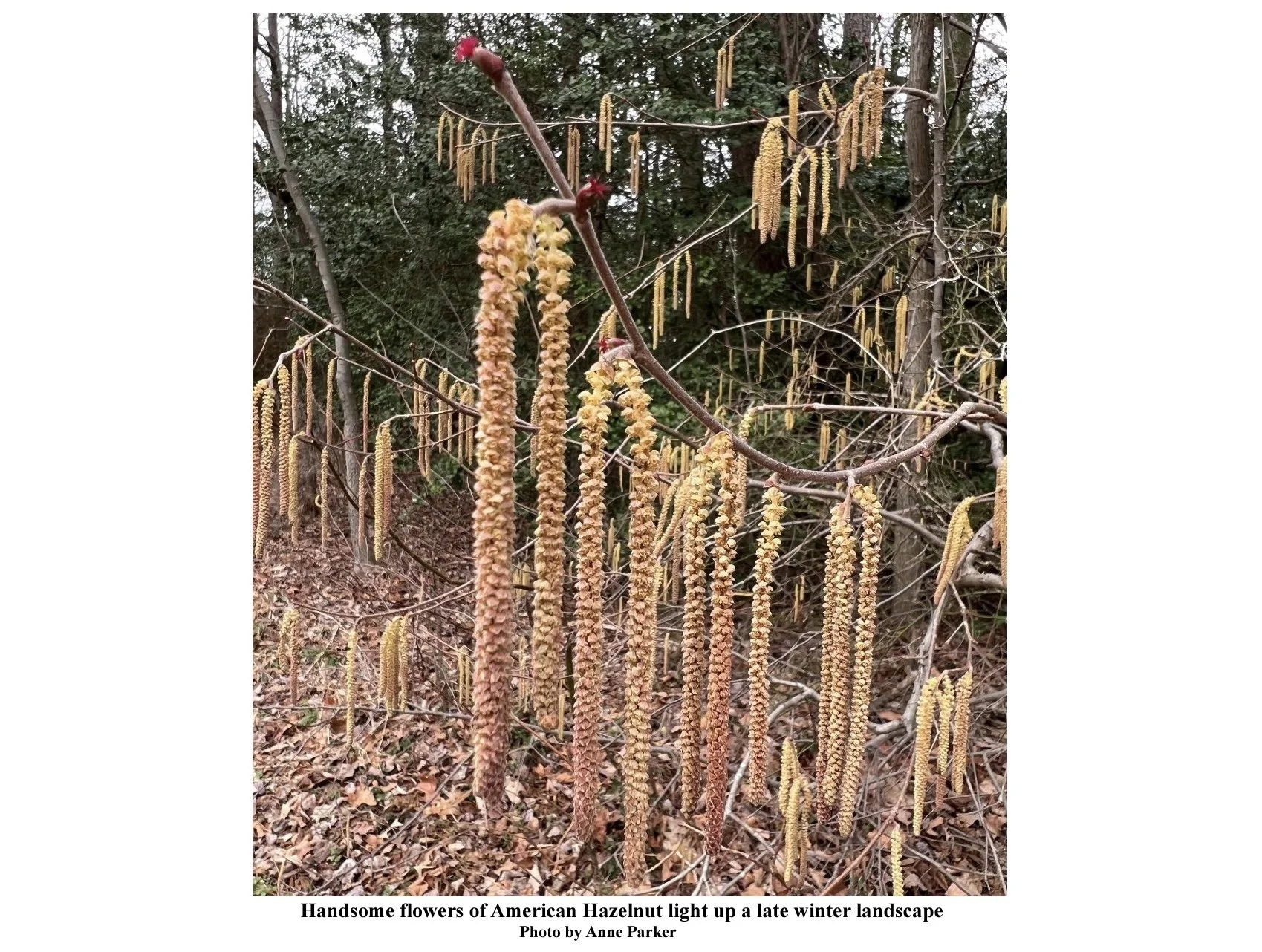 Our February Plant of the Month, American Hazelnut or Filbert, Corylus americana, is one of our earliest blooming native shrubs, a true harbinger of spring often flaunting its flowers as early as February. As a member of the Birch (Betulaceae) family, American Hazelnut is monoecious, meaning it has separate male and female flowers on the same plant. Like other members of the Betulaceae, the male flowers are held in narrowly cylindrical “catkins” (slim, cylindrical unisexual flower clusters) that dangle gracefully, two or three together near the twig tips. Elongating over the winter until they are 3 or 4” long, the pendulous catkins appear to drip from the slender branches creating a lovely late winter display. Each catkin contains numerous tiny flowers, each with a pair of tiny bracts and four stamens. Pollen is dispersed by wind to pollinate the tiny ruby red female (pistillate) flowers. Several are held together, extending beyond a swollen bud that is bsurrounded by red protective bracts. The flowers have no true petals, instead the small red stigmas create the ‘show’. Noted native plantsman, William Cullina, in his book, “Native Trees, Shrubs, and Vines” poetically describes the tiny female flowers as “sublime… fine ruby red stigmas poke from knobby red buds like little snake tongues to lick up pollen”. Ah, beauty and awe are so often in the details!