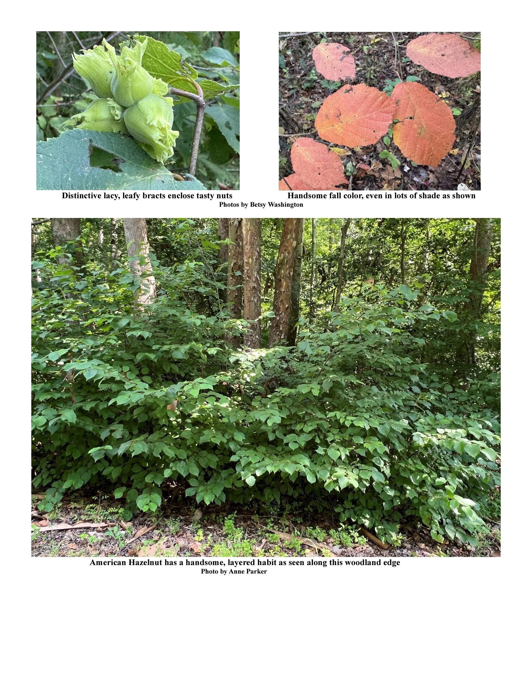 The deciduous American Hazelnut is quite handsome when given a few hours of sun, exhibiting an arching and layered, spreading habit and four seasons of interest. Capable of reaching 4 - 15’ high and nearly as wide, it grows naturally in a variety of habitats including both dry and moist upland mixed oak and oak- hickory forests, along woodland edges and openings as an understory shrub, in sandy thickets and well drained floodplains. In Virginia’s coastal plain I even find it along the edges of poorly drained, calcium-rich seepage swamps as in Cabin Swamp in Hickory Hollow Natural Area Preserve and along the Dragon Run in the Middle Peninsula. This rhizomatous shrub can sucker into colonies, creating excellent wildlife habitat and preventing erosion. The broadly oval leaves alternate along the stems with doubly serrate margins and can reach 3 – 6” long with distinctive pubescent stalks. Fall color is variable but often quite lovely, with warm shades of orange, rose, purple-red and yellow, even in heavy shade.