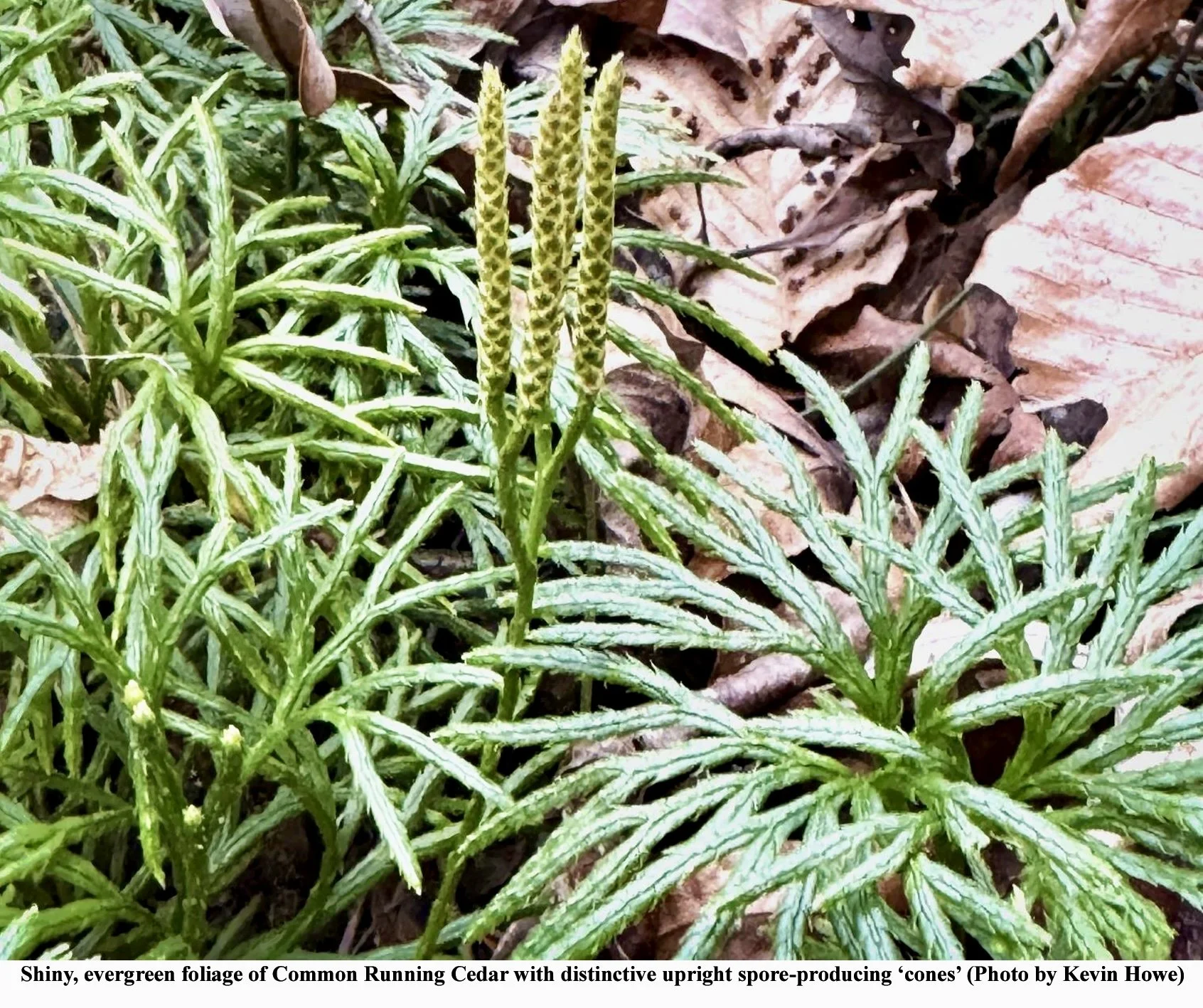 One of my favorite plants during winter walks in the woods is the Common Running-cedar. This lovely but distinctive evergreen plant is common across Virginia in moist to dry acidic forests, especially in disturbed or successional forests with mixed pines, oaks or tulip poplars. It belongs to a group of small primitive vascular plants known as Clubmosses that stretch way back in the fossil record. At one time, these were large and formed huge forests that are the basis of many of our coal deposits. Common Running cedar is the most widespread of the 11 Clubmoss species in Virginia and is known by various common names besides Common Running-cedar including Southern Running Cedar, Running Pine, Fan Clubmoss, Turkeyfoot and more. Despite the common names, these diminutive plants are neither cedars nor pines but are so named because they do resemble miniature cedar trees (especially Atlantic White Cedar) with their short upright stems rising only 4 – 8” and flattened branches spreading out in a fan-like pattern, giving rise to the common name Fan Clubmoss. Each branch is covered with four rows of dark green, shiny, scale-like leaves that are pressed tightly against the stems. These short stems are connected by long runners that trail along the surface of the ground often hidden under the leaf litter. Short aerial stems emerge every foot or so. Over time Common Running Cedar can form extensive vegetative colonies that make an exceedingly beautiful evergreen groundcover with the shiny dark green foliage and extraordinary texture that light up our winter woodlands.