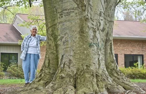 Hilda Wilson, Chapter member, dwarfed by the third largest American Beech in Virginia – 116 ft in height, over 15 foot circumferance and 103 foot crown