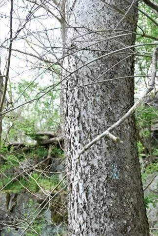 The distinctive gray bark of the Common Hackberry with warts and ridges